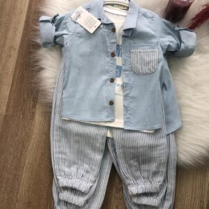 – Üç parçadan oluşan şık takım elbise, erkek çocukların günlük ve özel günlerde rahatlıkla tercih edebileceği bir seçenektir.; – Bağcıklı kemer/kuşak detayı ile modern bir görünüm sunarken, yarım pat düğme kapama şekli pratik kullanım sağlar.; – Gömlek yakası tasarımıyla resmiyetten uzaklaşmadan şıklığı yakalamayı mümkün kılar.; – Chino cep yapısı hem fonksiyonel hem de estetik bir dokunuş katmaktadır; baskısız deseniyle sadeliği ön plana çıkartır.; – Tüm sezonlarda giyilebilen bu takım elbise, mevsim koşullarına uyum sağlayarak her zaman moda olmanızı garanti eder.; – Regular boy kesimi sayesinde konforlu bir oturuşa sahip olan pantolon, hareket özgürlüğü tanırken stilinizi korumanızda yardımcı olur.; – Dokuma kumaşı dayanıklılığı arttırarak uzun süreli kullanım imkanı sunarken, %100 pamuk materyali cildinize nazik davranır.; – Standart kol tipi ile günlük aktivitelerinizde rahat etmenizi sağlarken, uzun kol boyu serin havalarda ekstra koruma sunar.; – Gömlek-pantolon alt-üst takımı olarak tasarlanmış bu set, kombin yapmayı kolaylaştırarak zamandan tasarruf etmenize olanak tanır.; İÇERİK:GÖMLEK PANTOLON TİŞÖRT