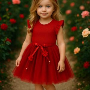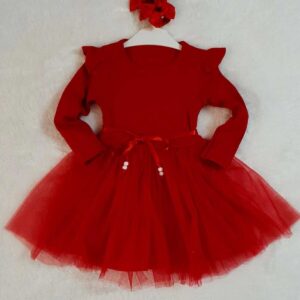 Kız Çocuk Özel Gün Doğum Günü Günlük Abiye Hediye Uzun Kollu Kırmızı Tül Detaylı Prenses Elbise
